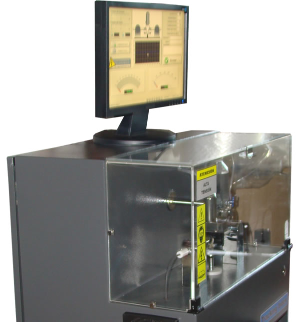 Nuestro equipo para el ensayo de Encaminamiento Electrico somete, a la muestra bajo ensayo una tensión de 0 a 600 Vca (1000 Vca a pedido) por medio de dos electrodos con una carga de 1 Newton. Entre los electrodos gotea una solución conductora a intervalos regulares programados.